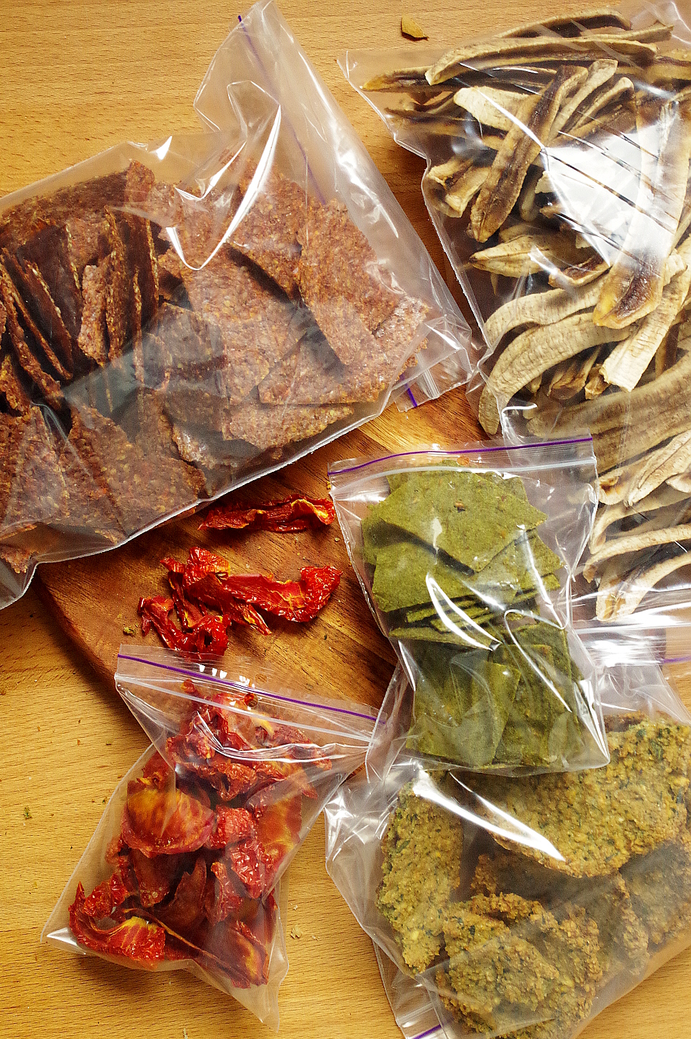 - сушеные овощи и фрукты (например,яблоки, бананы и томаты – мое любимое);