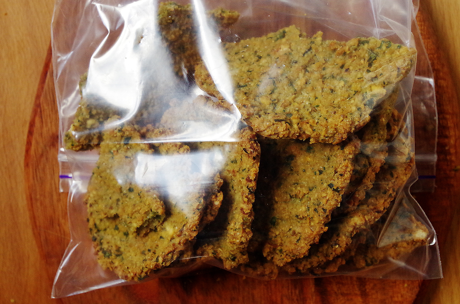 Еще одно открытие для меня - чипсы по мотивам фалафеля. Основа – вполне фалафельная, то есть, замоченный на ночь нут, измельченный потом в блендере, плюс к нему сырой лук (мелко), зубчик чеснока, специи (зира, коиандр), соль, кунжут, измельченный в муку. Только готовила свой фалафель я не во фритюре кругляшами, а запекала в духовке тонкими лепешками. Получилось вкусно, лепешки хрустят и могут долго не портиться! Пока пеклись, почему-то пахло котлетами.