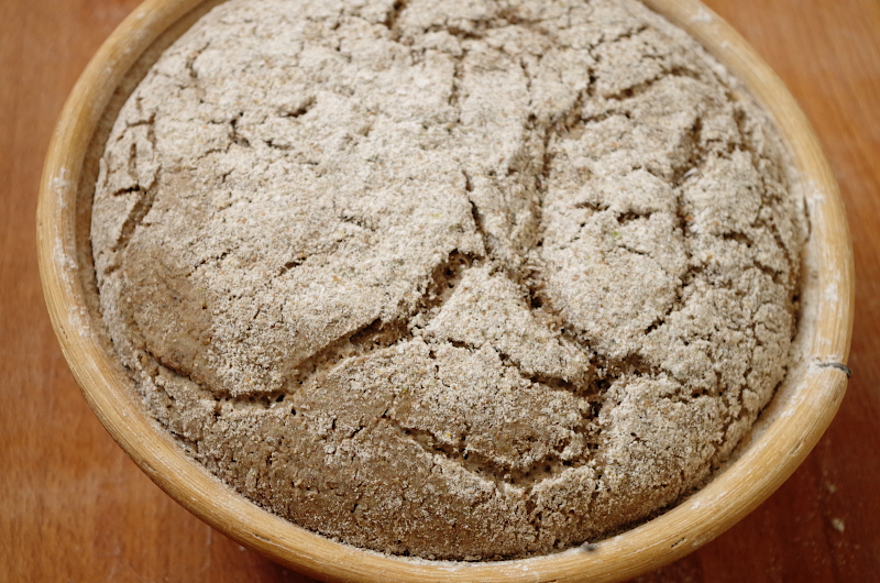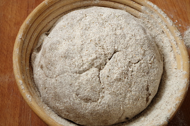 Не обминая и стараясь работать аккуратно, сформуйте из теста шар, уложите в круглую корзинку (диаметр 22 см.), посыпанную мукой, швом вниз. Расстойка около 60 минут при 28-30 градусах. Как только сформуте тесто, включите духовку греться с камнем (я пекла на круглом керамическом камне Emile Henry), температура 240-250 градусов.