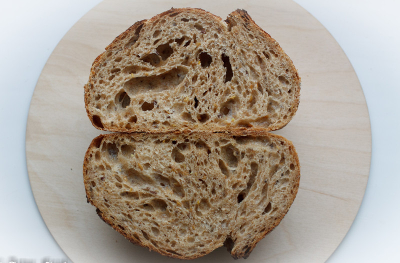 Тогда в рецепте оставляем только закваску, но во время смешивания ингредиентов для аутолиза, часть воды по рецепту замещаемой фруктовой водичкой. Ее количество может варьироваться в произвольных значениях, но имейте ввиду, что, чем больше будет дрожжевой воды, тем быстрее будет протекать созревание теста и готовность к выпечке, поэтому внимательно следите за ним.