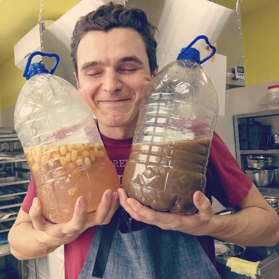 Артур: После того, как получили свеженькие дрожжики, пора позаботиться об их сохранности и накоплении ими сил. Некоторые могут закидать меня остатками закваски за сказанное, но все же я порекомендую переселить культуру в пластиковую бутылочку емкостью 0,5 - 0,75 л. Эта мера облегчит вам понимание степени зрелости фруктовой воды, кроме того, пластиковая бутылка хорошо выдержит напряжение, создаваемое газами, которые вырабатывают дрожжи. Благодаря способности герметично держать высокое давление, на пике зрелости дрожжей бутылка будет выглядеть так, будто внутри у нее сильногазированная минералка. Также на этом этапе вы можете попробовать фрукты или ягоды, которыми кормили дрожжи, они будут раздутые от газа и несладкие: весь сахар съели дрожжи, оставив вместо него газ! Вот теперь бутылку можно отправить в холодильник для недолгой консервации (3-5 дней), а если надумаете оставить их на более длительный период (1-2 недели), то добавьте в бутылку немного сахара (1-2 ч.л.) и можете смело отправляться в разъезды и отпуска, дрожжи вас будут ждать.
