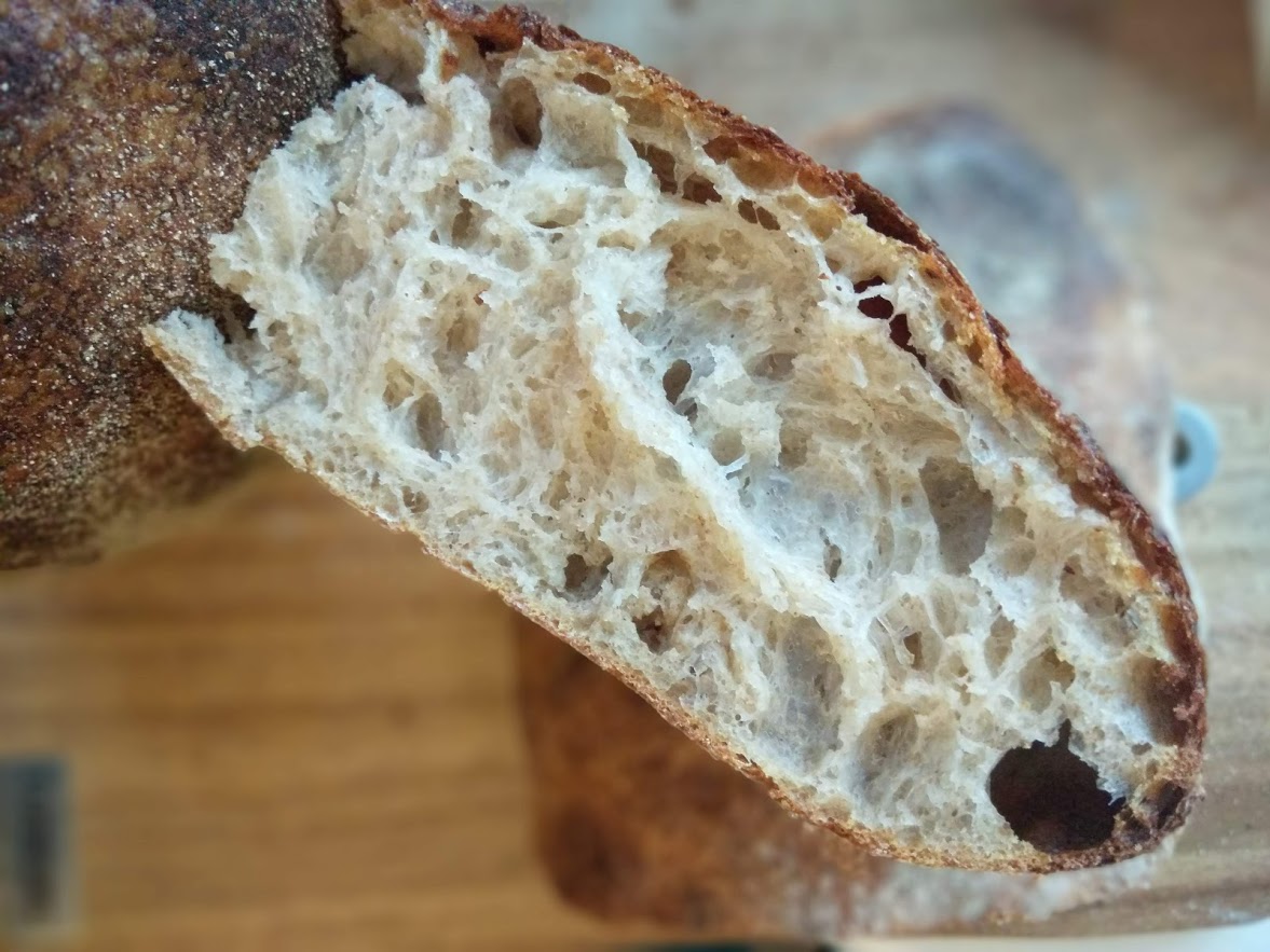 Вкус у такого хлеба мягкий, пшеничный, очень приятный, без тени кислинки (для неутомимых борцов с кислинкой это выход). Мякиш у хлеба на фруктовых дрожжах получается не таким эластичным, но более легким и пушистым, он получается таким именно благодаря более низкой кислотности хлеба. Если бы было больше кислот, мякиш был бы тягучим и эластичным, как у заквасочного хлеба. И в целом мякиш хлеба на фруктовых дрожжах сопоставим с мякишем хлеба на дрожжах (хорошего хлеба, не ваты из магазина), и даже имеет ряд присущих дрожжевому хлебу недостатков. Он сохнет, черствеет несколько быстрее, чем хлеб на закваске (но все равно намного медленнее, чем магазинный), и со временем он может начать растить на себе плесень (допустим, через недели полторы хранения в неблагоприятных условиях, в закрытом пакете в теплом помещении), не в пример хлебу на закваске. Мне до сих пор это не привычно: нельзя забыть полбуханки на две недели, а потом найти ее и съесть (я люблю сухари)).