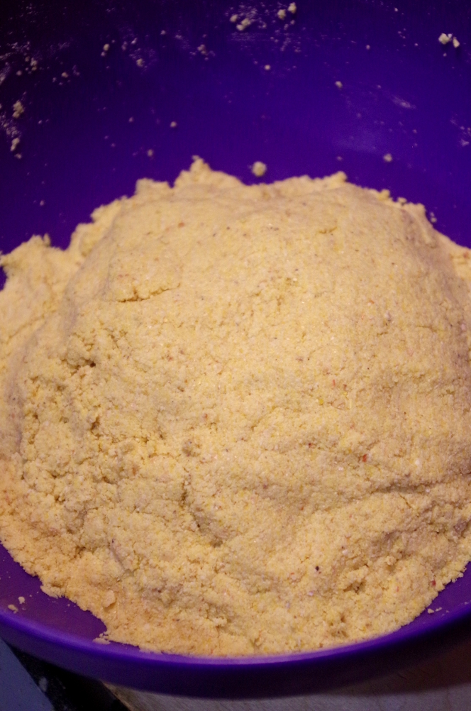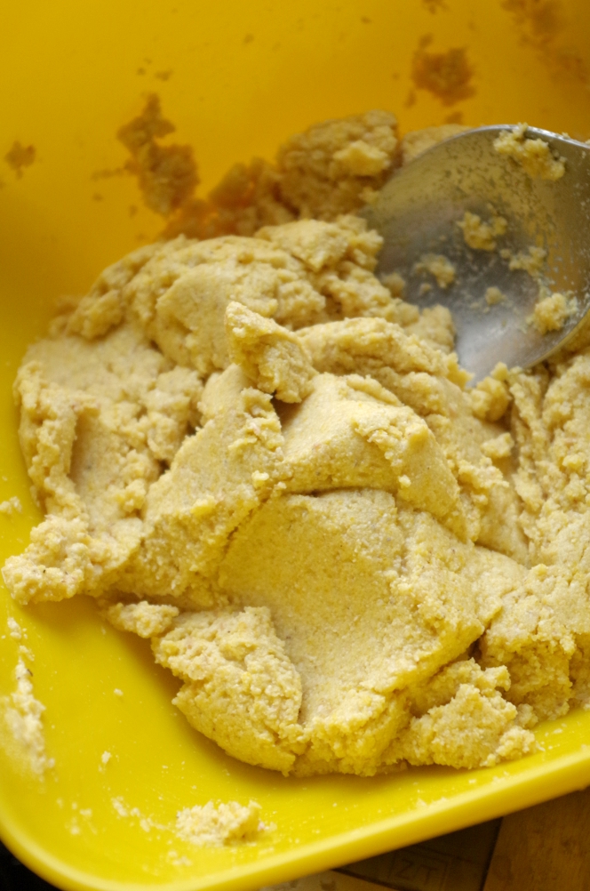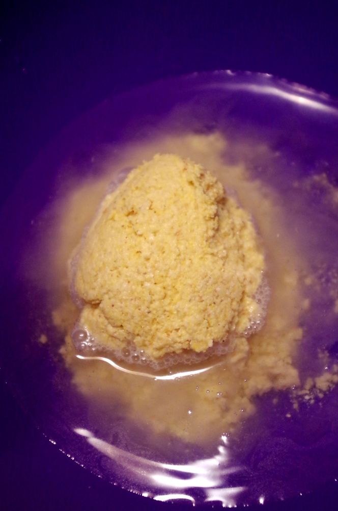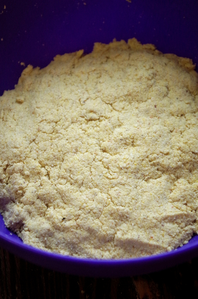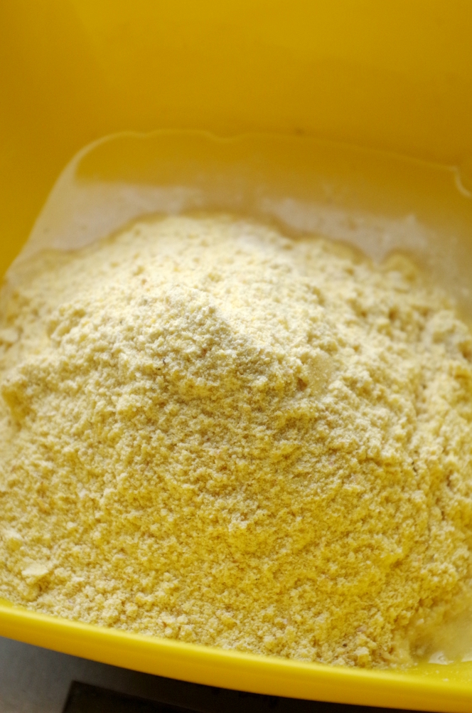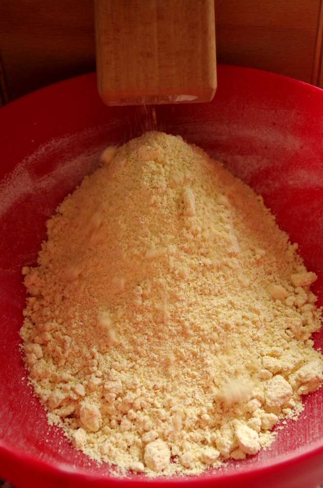 Кукурузная мука смалывается не так, как пшеничная и иначе себя ведет. Я молола на самом мелком помоле, мука буквально выскакивала из мельницы комьями, вместо того, чтобы свободно сыпаться, как это было с пшеницей, и после помола была довольно горячей.