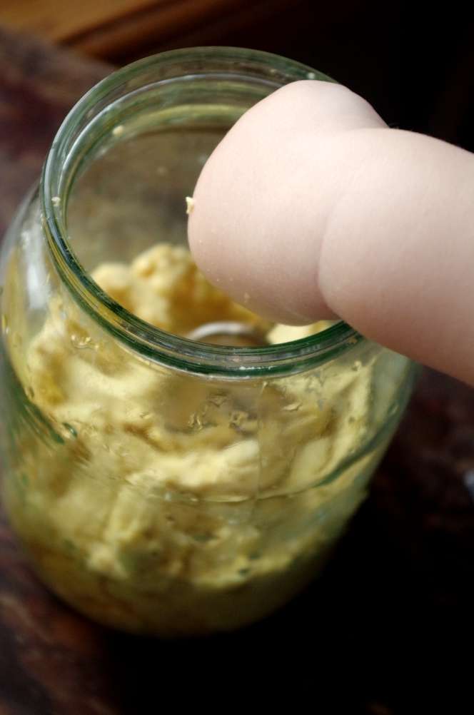 Я переложила тесто в банку, Маша мне в этом активно помогала.