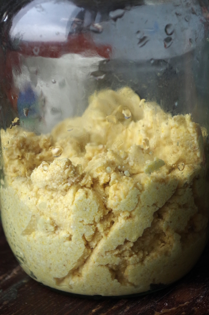 Для начала, кончено, нужно восстановить бакфермент и вывести кукурузный стартер. Схема действий практически такая же, как и с предыдущим концентратом – выводится в два этапа, в течение одних суток, в тепле, температура которого максимально приближена к 30 градусам. Я сняла пошагово, чтобы наглядно было себе и тем, кому это будет интересно и нужно.