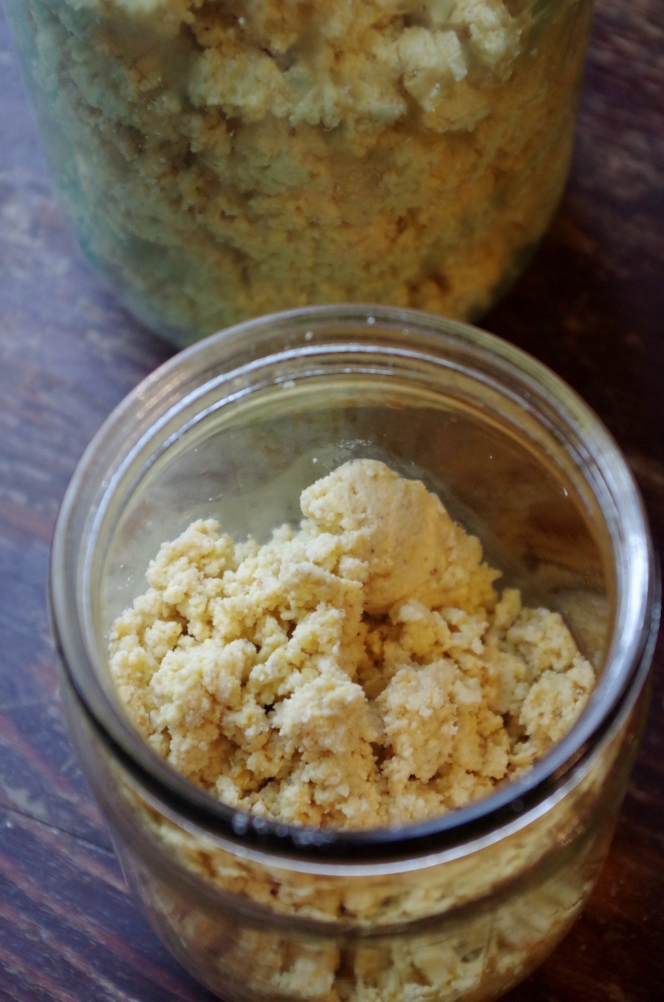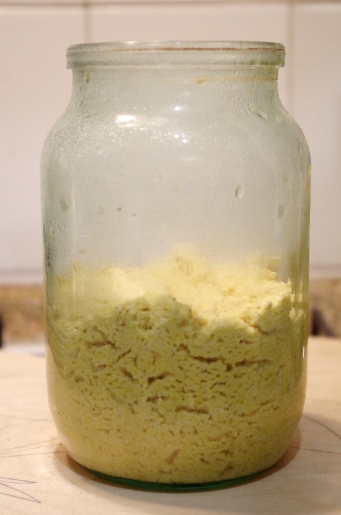 Я по глупости восстанавливала бакфермент в тех объемах, которые указаны в инструкции, но это довольно много, особенно в случае, когда, все же, в семье чаще печется обычный хлеб из пшеничной муки. Переложила его в две банки: литровую и поллитровую, и спрятала в холодильник. На фото видно, что внутри тесто не довольно рыхлое, хоть и тяжелое.