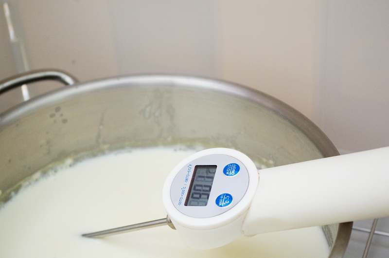Включила шкафчик греться до 90°, через 30 мин. поставила на плиту кастрюлю с молоком (примерно 1,5 л.), использовала термометр-щуп Matfer, точный и оперативный.