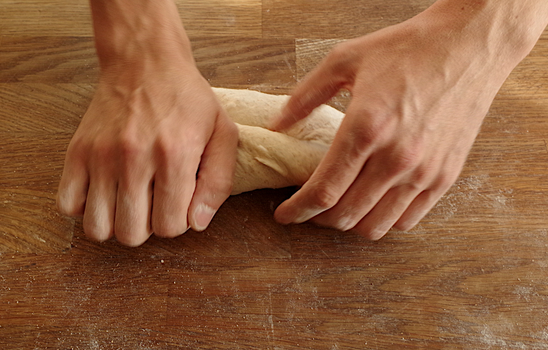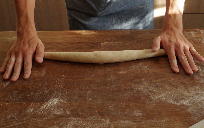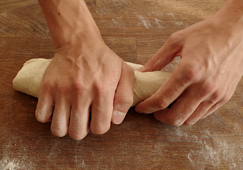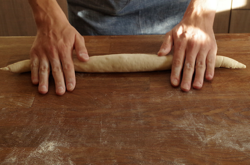 В финале, если хотите получить остроносые багеты, слегка придавите края и покатайте их по столу, но не продавливая центральную часть. В процессе раскатки заготовка должна слегка удлиняться, но постарайтесь не слишком сильно ее растягивать, чтобы багет не стал слишком худым и длинным, а то может не поместиться в духовку или получиться слишком сухим.