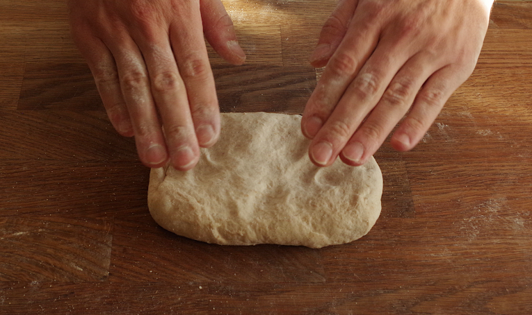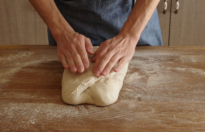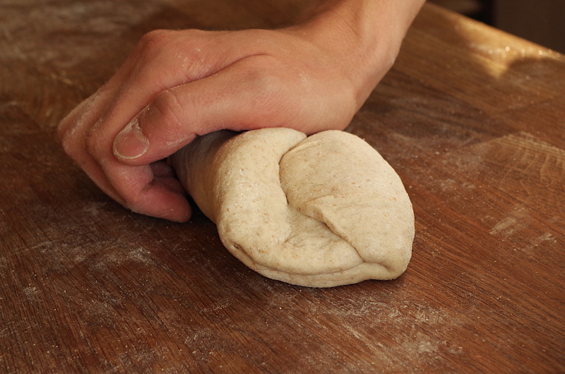 Сама предформовка представляет собой скручивание теста в рулет, но не переусердствуйте. Это следует сделать очень аккуратно, не травмируя тесто, в идеале сделать 1-2 оборота, не больше, и уложите швом вниз. Оставляем тесто минут на 10 для отлежки, присыпав мукой и накрыв пленкой, чтобы уберечь от заветривания.