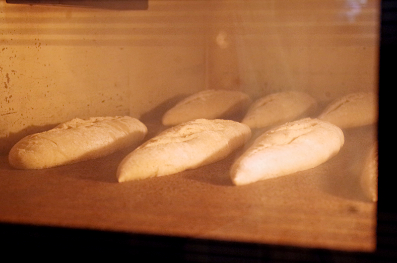 Обязательно побеспокойтесь о пароувлажнении: вместе с духовкой прогерйте жаропрочную емкость (это может быть сковородка на дне духовки, или противень), и сразу после посадки багетов, плесните туда примерно 100 мл. кипятка. Этого должно хватить, чтобы корочка не схватилась сразу от высокой температуры, а продолжала быть влажной и эластичной. Если вы заметили, что вода очень быстро испаряется и увлажнения корке недостаточно, налейте больше кипятка. мы пекли эти багеты в подовой шамотной ремесленной печи Haussler.