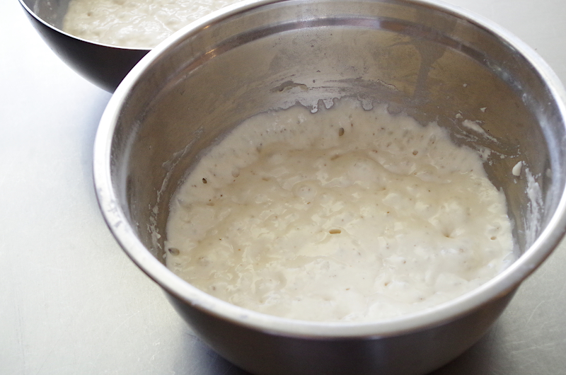 Как только обе культуры созрели, возьмите большую емкость и смешайте по рецепту: закваску, опару, воду, все виды муки, после чего оставьте тесто на 20-30 минут для аутолиза.