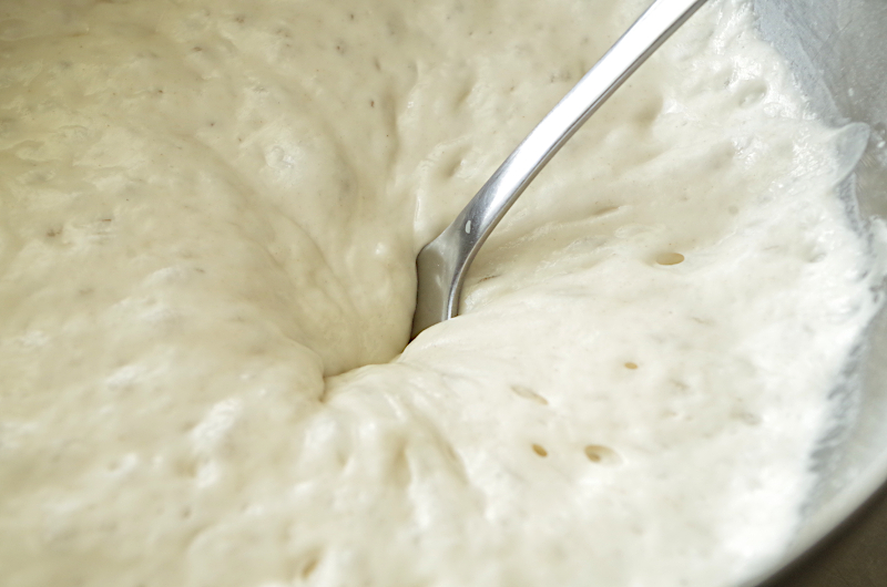 По истечении указанного времени добавьте в тесто соль и начините замес. Поскольку тесто будет мягким, предпочтительна техника отбивания теста.