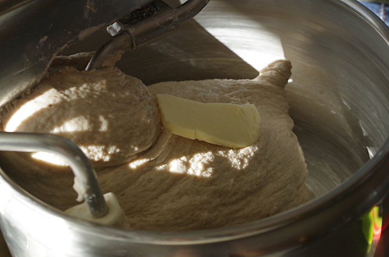 Примерно на десятой минуте можете внести в тесто сначала сахар (мед) и потом масло и промесить его еще минут десять. Развивать полностью клейковину нам не надо, так как тесто должно пережить ферментацию и то, что вы не домесили отбиванием, доведете складываниями.