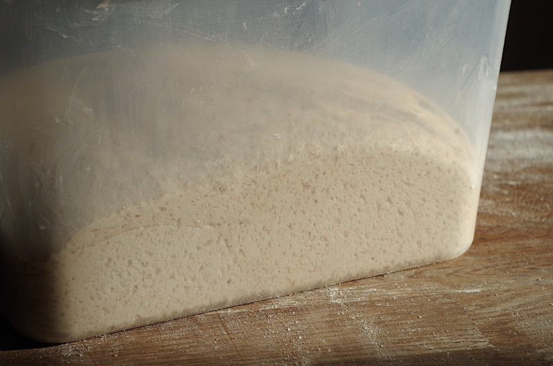 Уложите в контейнер. После оставьте тесто еще на 2-2:30 часа. В итоге, общее время ферментации - 3-3:30 часа при температуре 22-24 градуса.Такая длительная ферментация может показаться избыточной, учитывая что там присутствуют фруктовые дрожжи, но в этом и состоит суть дать максимальное разрыхление тесту, чтобы получить хорошее раскрытие мякиша. В итоге тесто у вас должно вырасти как минимум в два раз, стать очень мягкими и воздушным. Получилось? Тогда приступаем к следующему шагу - разделке и предформовке.