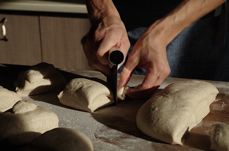 В идеале, угадывать кусочки нужного размера сразу, чтобы не дорезать маленьких и не делать из заготовки создание доктора Франкенштейна :) Рекомендуемый вес заготовки - 200-250 гр. максимум. Делать большие по весу заготовки нет смысла, так как домашние духовки не могут обеспечить правильные условия для выпекания, а размер заготовки большего веса будет больше, чем сможет вместить ваша камера. Если у вас нет пекарского камня, тем более тогда стоит ограничится весом в 200 гр.