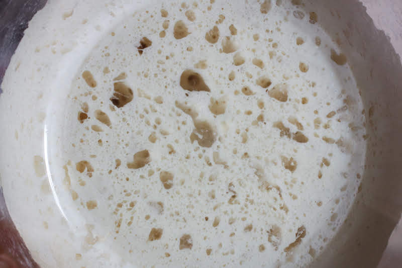 Как всегда, все начинается накануне вечером. Смешайте ингредиенты, необходимые для биги и поместите в емкость, которая сможет удержать в себе трехкратное увеличение объема, ведь примерно настолько увеличится размер биги в момент пикового созревания, а времени потребуется часов 10-12 при температуре 23-25 градуса.