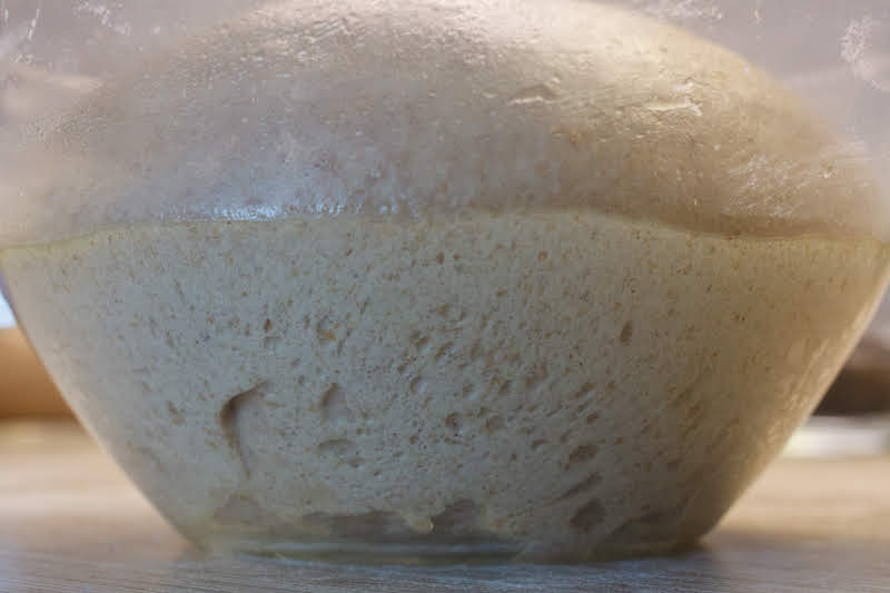 Общее время брожения составит 3,5 часа. Примерно через полтора часа проведите аккуратное складывание теста. Для этого хорошо подойдет смоченной водой стол, тесто к нему не будет прилипать, так как крутое и маслянистое. Знаком того, что ферментация прошла хорошо и пора приступить к следующему этапу, послужит хороший поедем (минимум в 2-2,5 раза), образование капсул с газом, которые вы сможете увидеть сквозь прозрачные стенки посуды, а также, ощущение воздушной структуры теста, при легком надавливании на поверхности или похлопывании по ней.