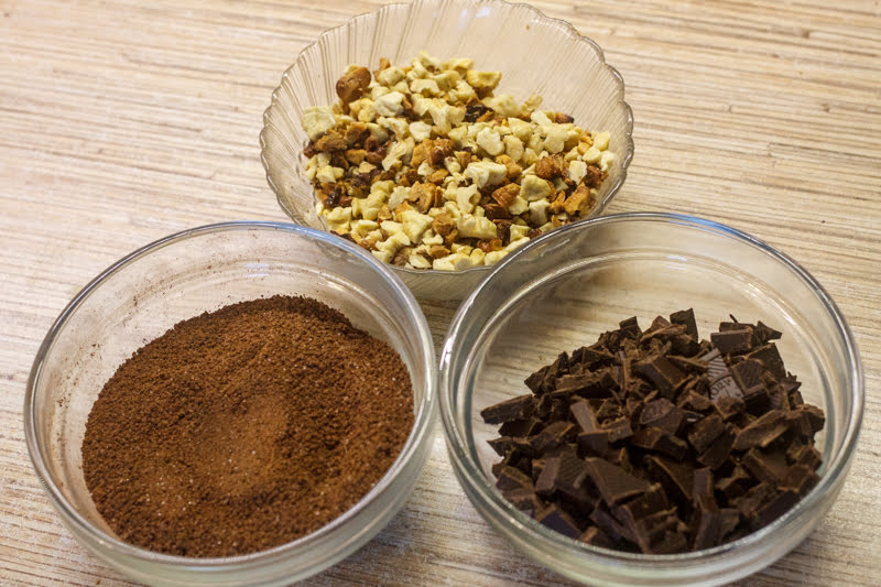 - Орехи слегка поджарить в духовке, снять шелуху и также порубить.