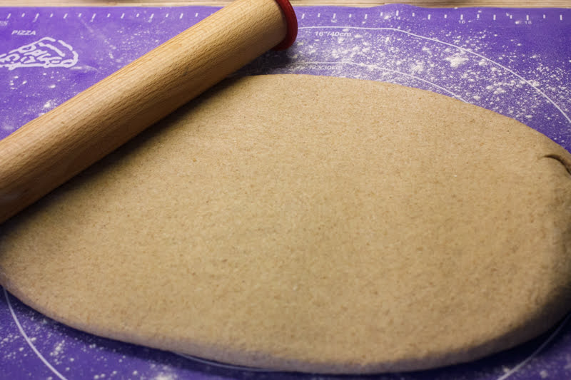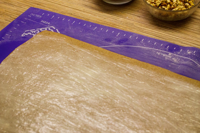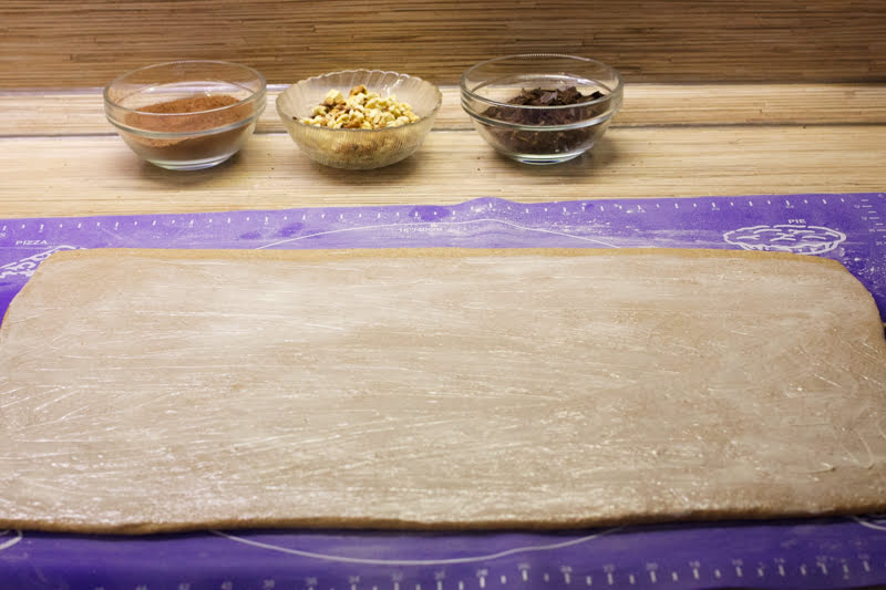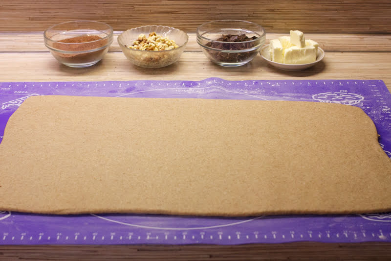 Раскатку теста лучше проводить на силиконовом коврике, это уменьшит необходимость частого подпыла стола и существенно упростит скручивание теста в рулет на финальном этапе. Рекомендуемая толщина раскатки - 3-4 мм, но смотрите по своим предпочтениям. Если раскатаете толще, не все добавки смогут поместиться.