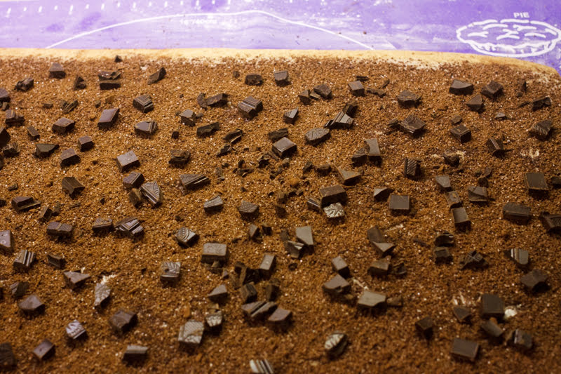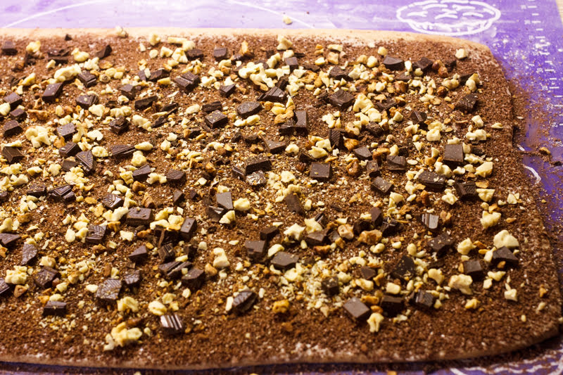 Следом за маслом равномерно насыпьте на пласт теста смесь из сахара-какао-корицы, затем орехи и шоколад.
