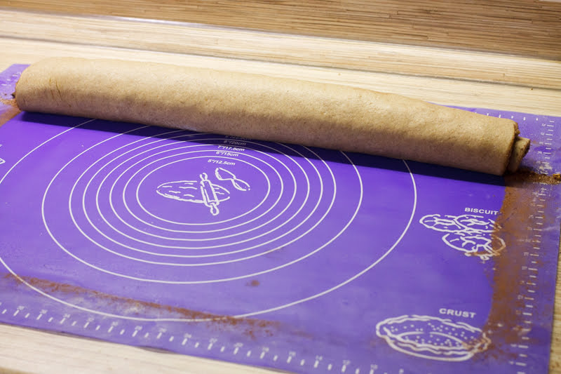 Перед скручиванием смочите водой тот небольшой участок теста, который мы специально оставили чистым без начинки, это сделает его липким и поможет лучше запечатать наши сладкие “колбаски”. Если используете силиконовый коврик, то процесс формования рулета достаточно прост: приподнимая коврик, скрутите тесто по направлению к тому участку, который мы оставили без начинки и смазали водой. Если у вас нет коврика, сделайте это все просто руками))