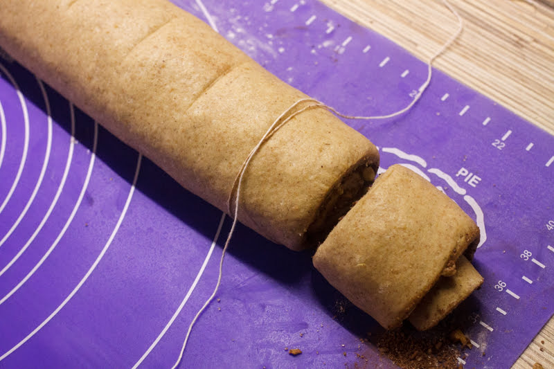 Вы получите толстую колбасу, наполненную всякими вкусняшками, но рано еще расслабляться! Этап нарезки на булочки рекомендую производить прочной ниточкой. Скребком наметьте на заготовке примерное количество желаемых синнабонов, далее протяните под колбасой нить и сверху, там где ставили метки скребком, потяните за края ниточки, как будто затягиваете узел. Таким образом вы сможете отрезать ровный кусок без смазанных слоев теста и выдавленной начинки.