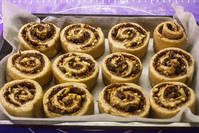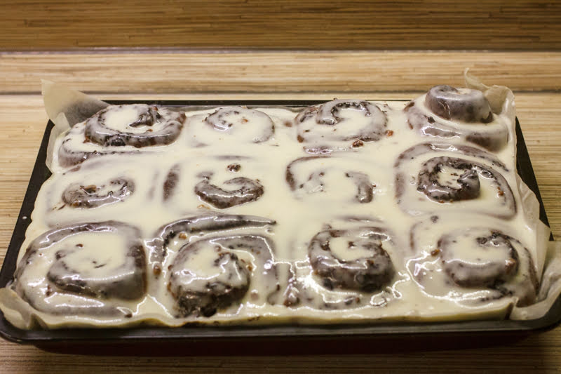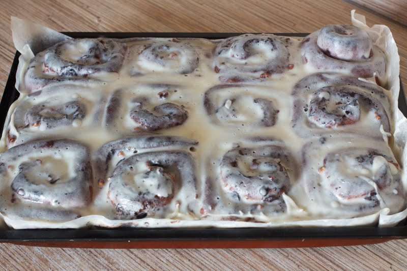 Выложите булочки на застеленный пергаментом противень или какую то другую подходящую форму, оставляя между булочками немного расстояния и обеспечив боковую поддержку крайним синнабонам. Накройте пленкой, чтоб поверхность теста не сохла, и отправьте на расстойку, которая займет 3-3,5 часа.