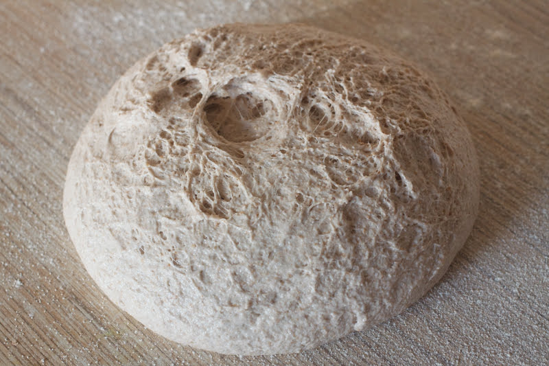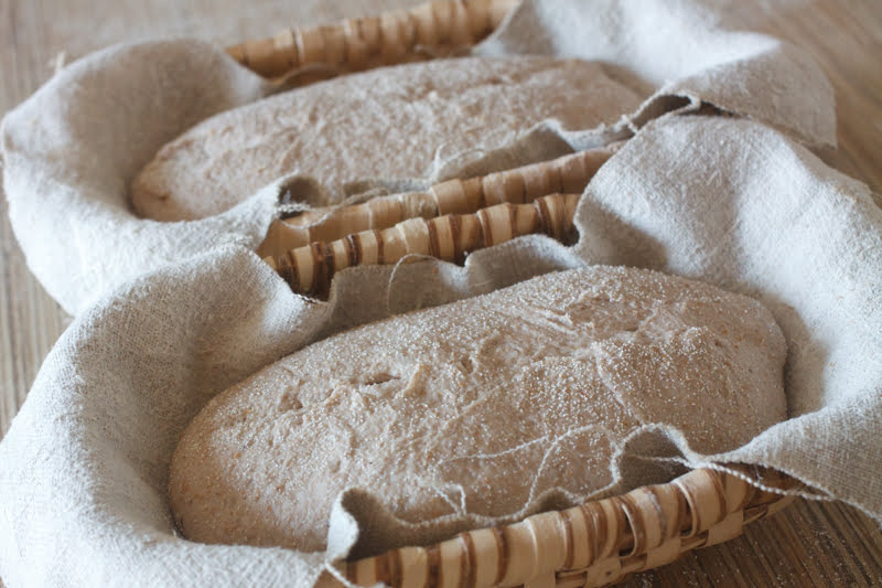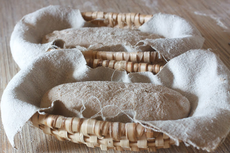 Спустя это время, оно должно немного подрасти и стать мягким, пышным и податливым для формовки :) Сформуйте круглые или овальные заготовки и перенесите их в корзинки швом вверх или на ткань швом вниз, и сразу начинаем греть духовку с камнем и колпаком, если используете, температура 240-250 градусов. Если не используете колпак, поставьте на дно духовки чугунную сковороду и грейте вместе с духовкой.