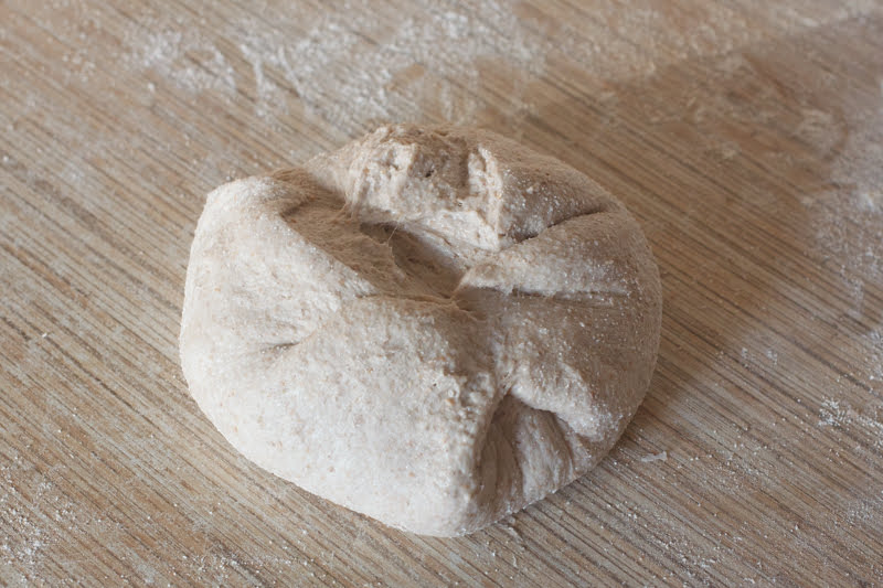 Через 60 минут после смешивания, делаем обминку (складывание) тесту прямо в миске: аккуратно подхватывая за края теста на станках, подтягиваем их чуть дальше за центр в противоположную сторону. Во время этого действия вы заметите, что тесто немного уже развило клейковину и при каждом новом движении оно будет становиться все туже. Как только почувствуете сопротивление растяжению, то можете взять влажными руками тесто в руки, немного округлить в ладонях и положить теперь местом, куда затягивали края (швом), на дно, чтобы сверху у вас была ровная шапочка.