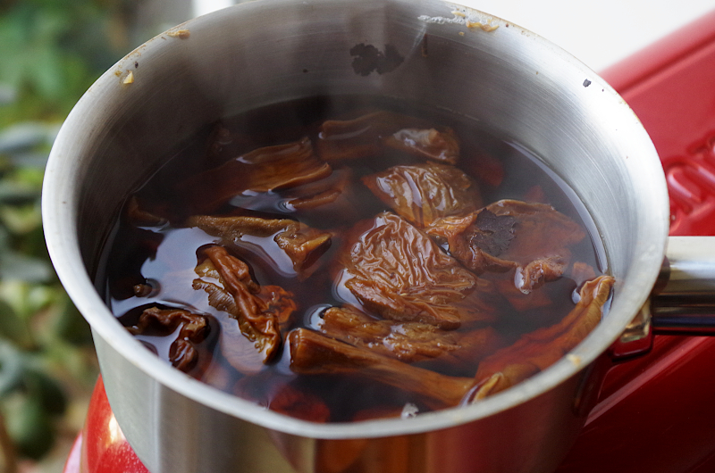 Грибы залейте водой и проварите минут 15, остудите, грибы отожмите, отвар не выбрасывайте. Взвесьте его, вам нужно 350 гр., если не хватает, долейте воды.