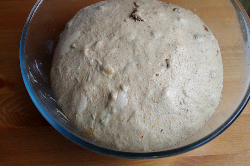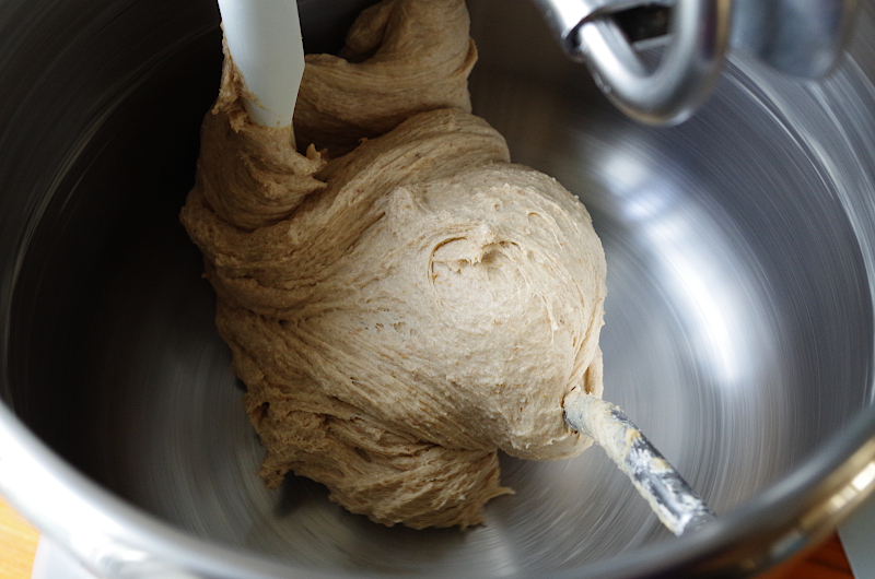 Смешайте закваску, всю муку и грибной отвар, оставьте на 30 мин. для аутолиза, накрыв чем-нибудь. Если месите руками, сделайте то же самое в подходящей емкости. Я для замеса использовала тестомес Ankarsrum.