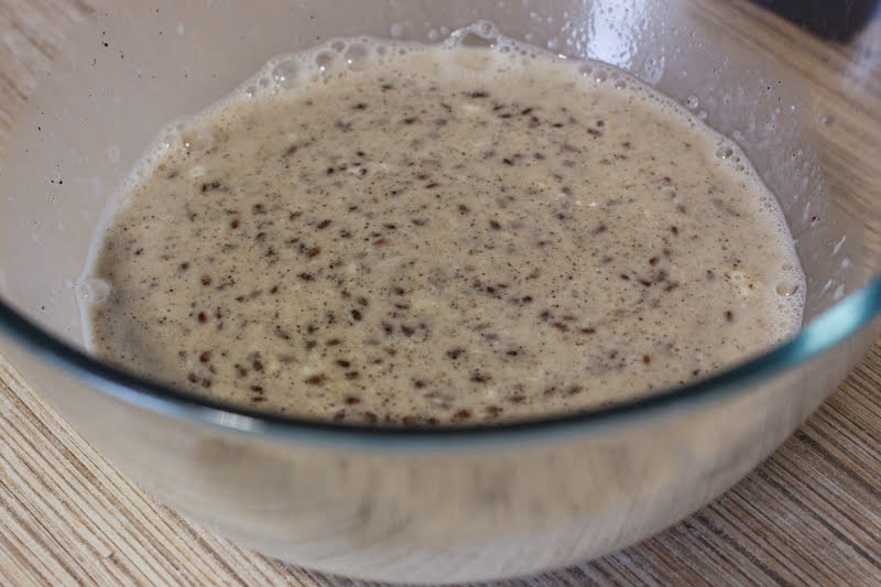 Подготовка в замесу этого хлеба проводится в два этапа: накануне нужно сделать заварку из льна и солода, и накопить закваску.