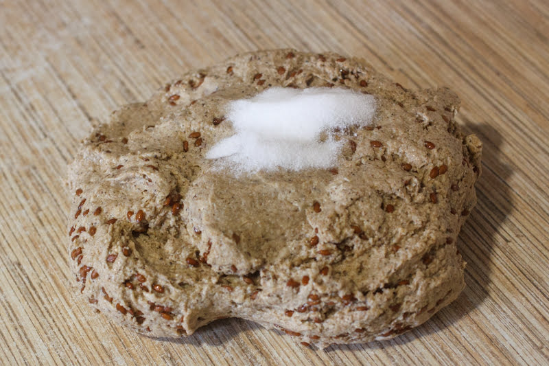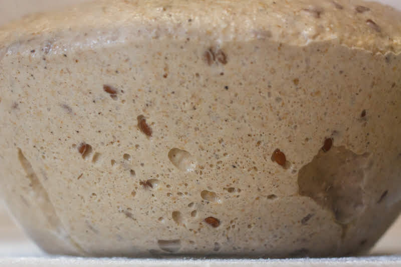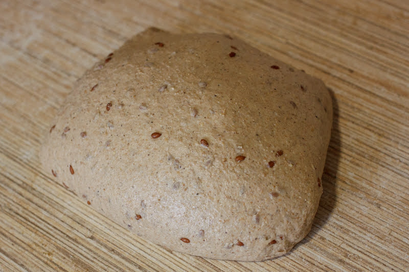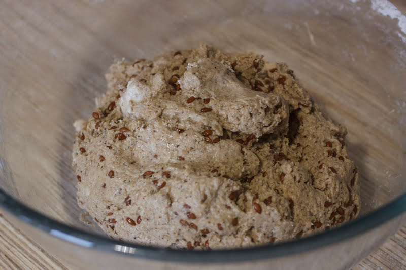 Прелесть этого теста в том, что оно достаточно быстро вымешивается до нужного состояния, но обратная сторона медали - оно получается липковатым и рвущимся из-за гречневой муки. В ручном варианте замеса хорошо подходит отбивание. Поначалу с ним будет сложно работать, но буквально на десятой минуте замеса оно уже будет собираться в упругий комочек и станет более послушным. Вымешивает в общей сложности около 20 минут, пока не увидим, что семена льна стали покрываться тонкой пленочкой теста, своего рода глютеновое окно получается :) В случае замеса тестомесом, необходимо внимательно следить за тестом. Спиральные имеют особенность быстро замешивать и точно так же быстро разрушать, так что начните с 5-7 минут на средней скорости, для Ankarsrum Original - 17-20 минут на второй скорости. После этого проверьте тесто на готовность, возьмите комочек мокрыми руками и мягко растяните во все стороны. Чем тоньше тесто будет получаться до разрыва, тем лучше. Но не стремитесь вымешивать прям до совсем тонюсенькой пленочки, так как оно может разрушиться на последующих этапах (ферментация, расстойка), особенно если у вас слабая мука. Самый щадящий тип замеса предоставляет нам Ankarsrum Original, поскольку его принцип замеса очень схож с ручным. Также прелесть его в том, что вы отчетливо видите, как развивается клейковина и в любой момент, без риска получить крюком по пальцам, можете исследовать тесто на ощупь. Когда видите, что оно собралось, стало гладким и не рвущимся, можете прекращать работу.