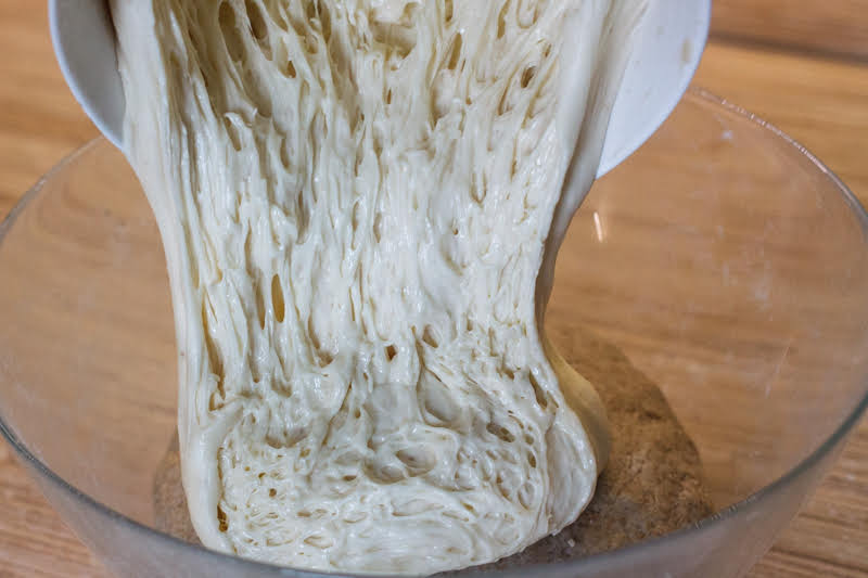 - Вот на этом этапе вам и откроется прелесть нынешнего метода: в течение беззаквасочного аутолиза тесто успело ощутимо развить клейковину, в результате чего интенсивной работы по замесу потребуется минимум. На активный замес у вас должно уйти около 6-7 минут. Если вы замешиваете в тестомесе Ankarsrum , рекомендации по времени те же, только используйте вторую скорость. Если же у вас спиральный тестомес, общее время замеса можете сократить до 3-4 минут, поскольку они замешивают интенсивнее.