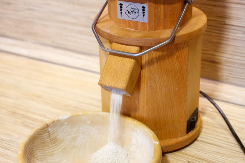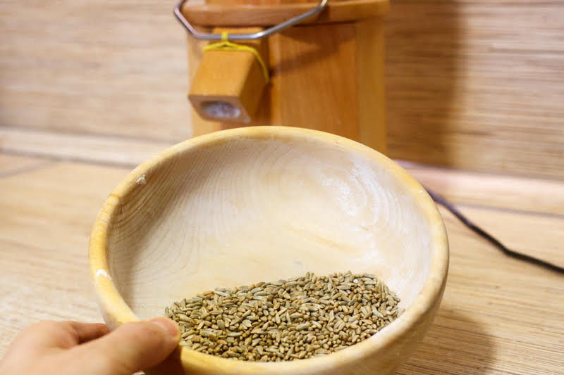 - Ранним утречком возьмите ржаное зерно и смолите его на домашней мельничке (в данном случае Hawos Oktini), ведь ничто так не обогащает вкус и аромат хлеба, как еще теплая после жерновов мука😉. Если у вас она еще не появилась, постарайтесь купить максимально свежую муку, а о причинах этого читайте тут!