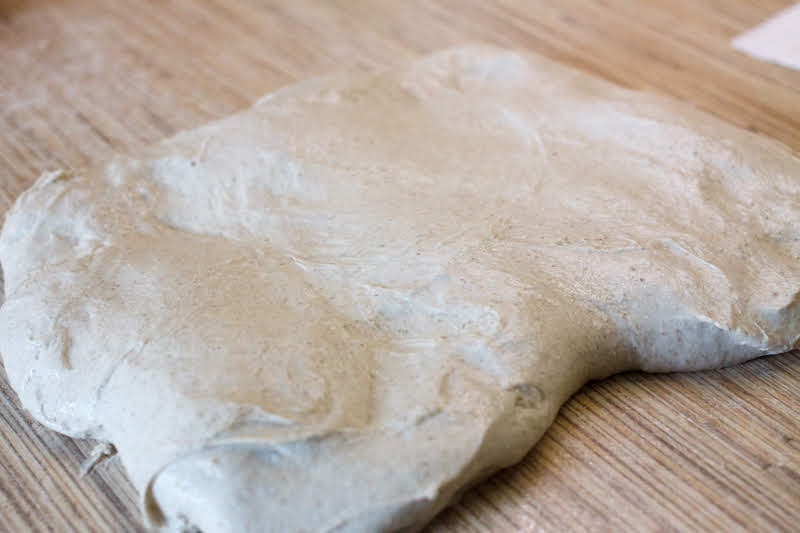 - Тем временем ваша закваска подойдет к пику и станет готова к внесению в тесто. Тут кроется причина уменьшенной влажности опары: она более крутая, а смешанное для аутолиза тесто более мягкое, в итоге их соединение пройдет легче. Смешиваем!