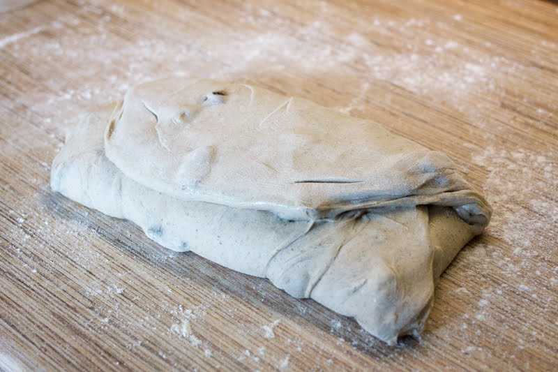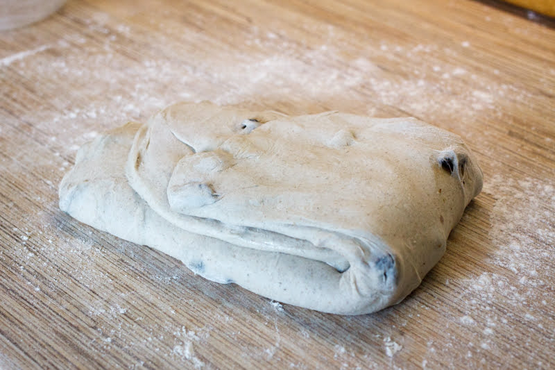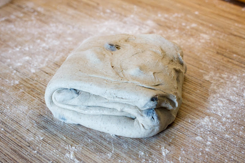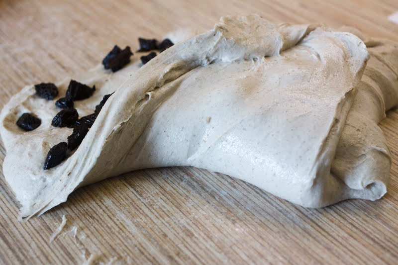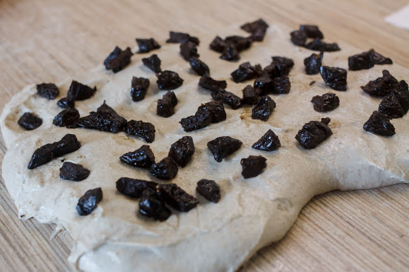 - В самом конце, когда тесто в ваших руках станет гладким и красивым, - внесите порезанный (не мелко) чернослив, в идеале путем складывания, а не перемешивания в тесте.