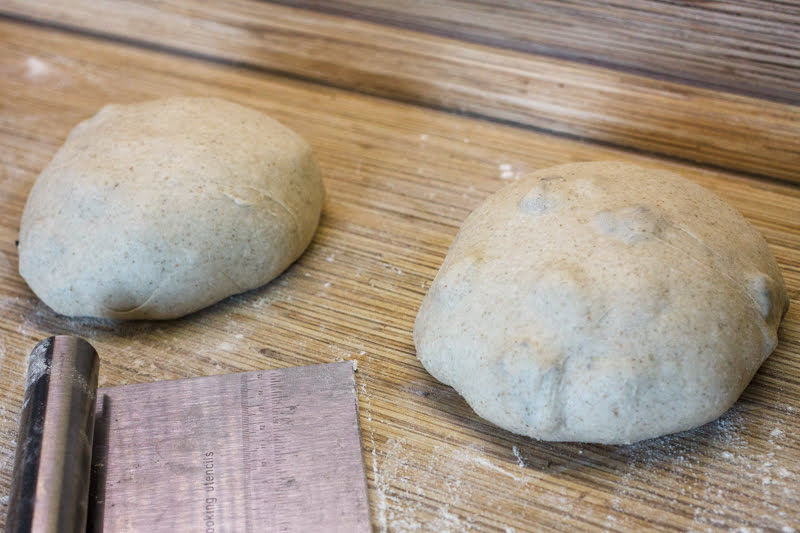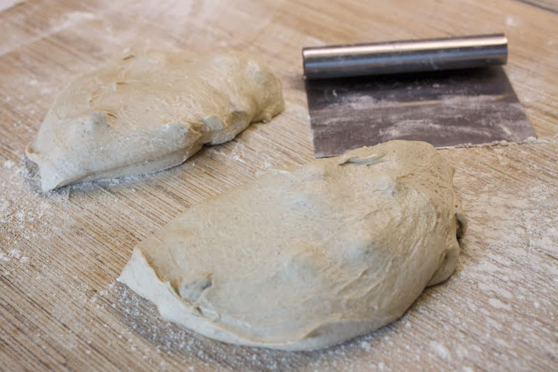 - Есть такое? Пора снова за дело! Подпылите стол мукой, вывалите на подпыл подошедшее тесто (использую пластиковый скребок, чтобы быстро, не разрывая и не растягивая, отскрести тесто от стенок). Разделку теста проведите металлическим шпателем, тут же округлите куски и оставьте отлежаться на 15-20 минут.
