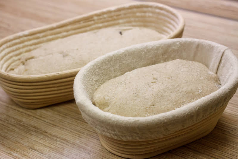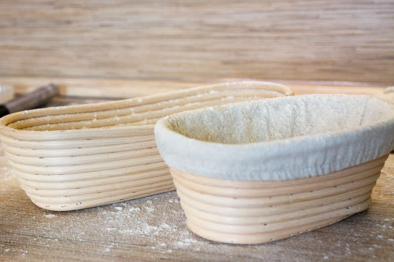- Пока у теста отдых, подготовьте корзинки: присыпьте их мукой. В смесь белой и цельнозерновой муки для подпыла стола и корзин я добавляю манку, с ней мука не так отсыревает.