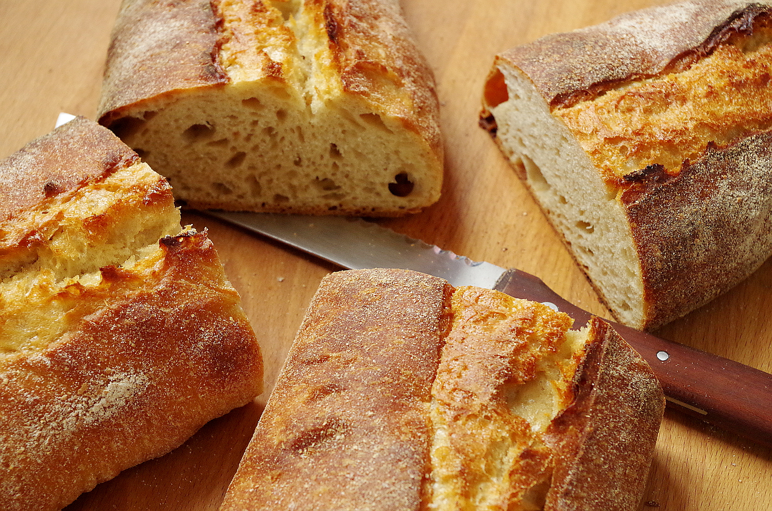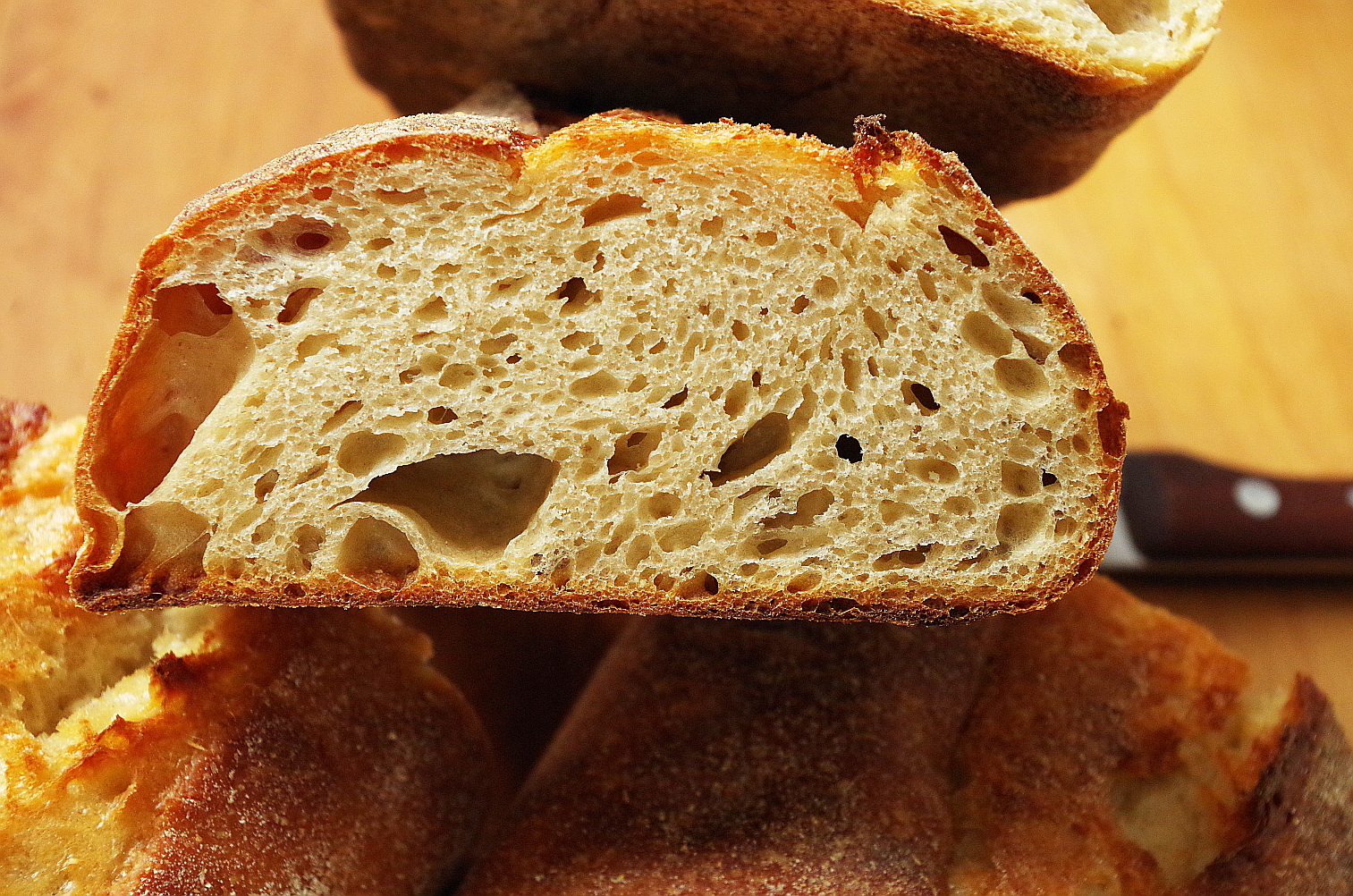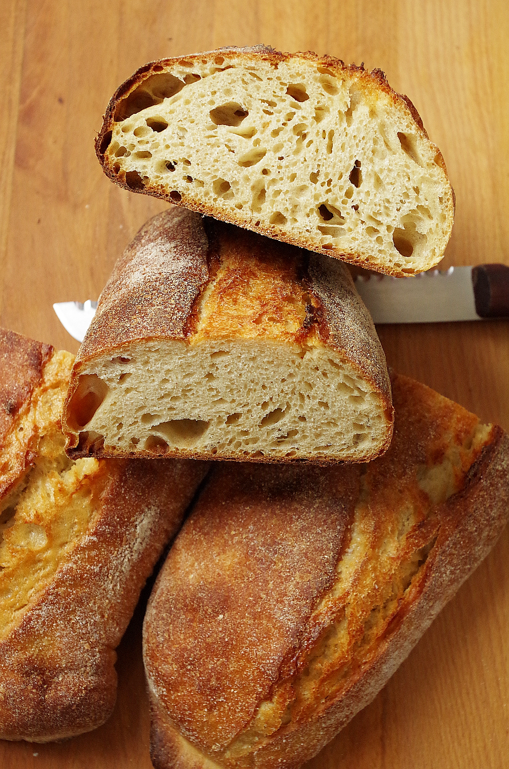 Чтобы проверить на практике, я решила испечь Французскую булку на густой и жидкой закваске и сравнить аромат и пористость, а за одно и скорость брожения. Признаться, прям огромной разницы между этими булками я не заметила. Тесто бродило примерно с одинаковой скоростью, в аромате свежеиспеченных булок, действительно, мне показалось, была разница, и что те, которые были на густой закваске, были душистее. Но в остальном большой разницы я не заметила, может даже, к сожалению.