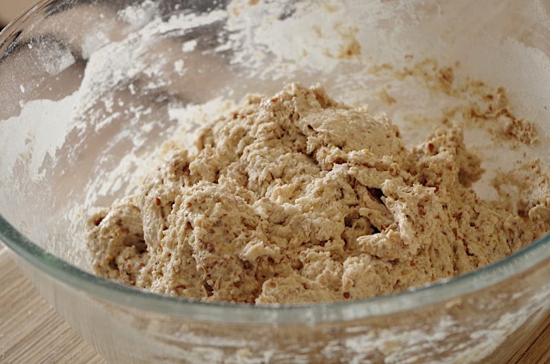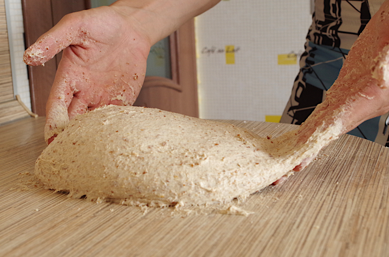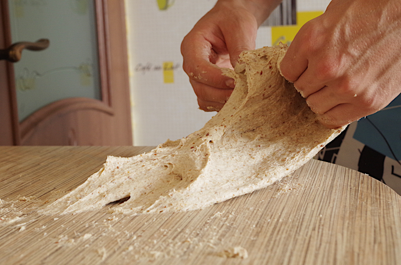 В составе есть свежесмолотая цельнозерновая ржаная и пшеничная мука, пшеничная закваска, белая мука, вода и соль. Это стандартный состав, хлебное тесто, которое вы при желании можете разнообразить, добавив немного семян (на фото вкрапления в тесте - это молотый лен, который мы быстро замочили 1:1 с водой и добавили при замесе, подсолнечник и другие можете не замачивать и добавить, предварительно обжарив или подсушив в духовке). Тестоведение практически не отличается от обычного хлебного, более того, из этого теста вы смело можете испечь формовой или подовый хлеб, пиццу и фокаччу.