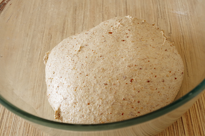 Смешайте закваску и воду, если замачивали лен, то и его туда же, перемешайте, добавьте всю муку и еще раз перемешайте. Оставьте на 30 минут для аутолиза.