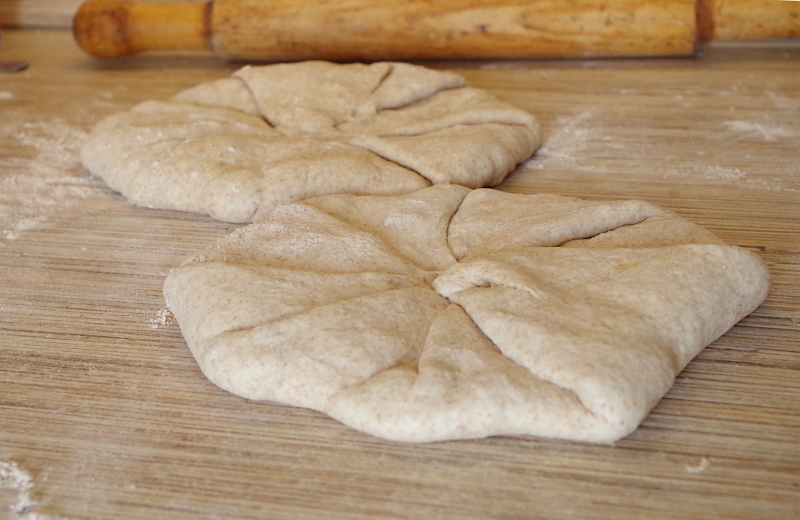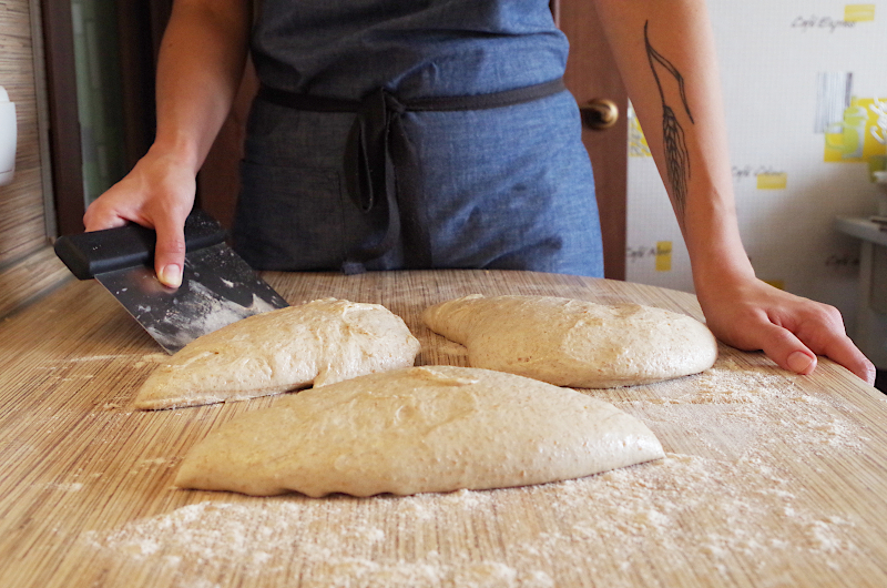 Разделите на 4 куска по 180-200 гр. (для точности взвесьте тесто и разделите на 4), каждый округлите или сформуйте овально. Отдых около 15 минут до расслабления клейковины.