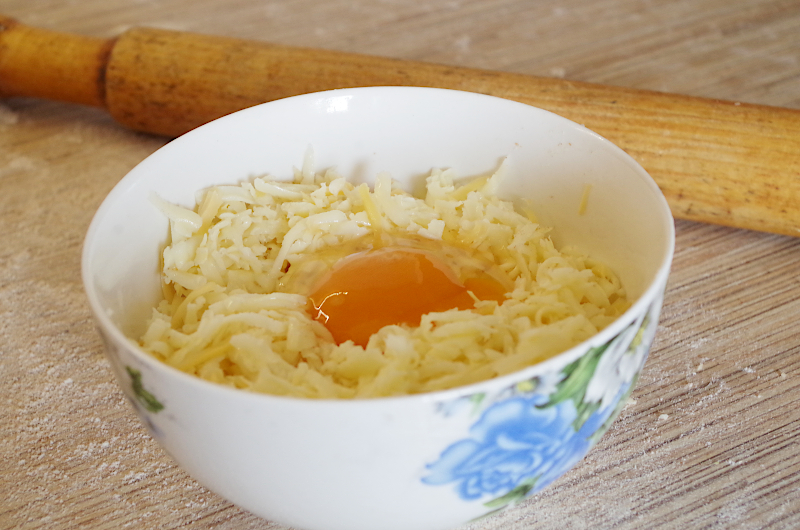 Сыр натрите, смешайте с яйцом, приправьте солью и перцем.