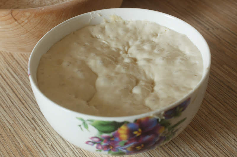 Смешайте воду, фруктовые дрожжи и муку, перемешайте до полного увлажнения муки, затяните пленкой и оставьте при комнатной температуре на 12 часов. Готовая опара будет выглядеть так: