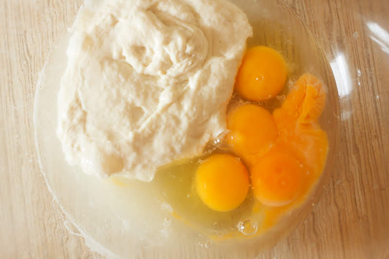 Если у вас есть тестомес, то кладем все, кроме соли, сахара и масла в дежу, включаем первую скорость и ждем полного перемешивания всех ингредиентов. Как только достигли этого состояния теста, выключаем, накрываем сверху пакетиком, пленкой или полотенцем, чтобы не заветрилось тесто, и даем отлежку в полчаса. А вот если вам менее повезло, то одеваемся посвободнее и готовимся к отличному фитнесу для верхней части тела)) Смешиваем закваску, воду, яйца, муку и так же оставляем на полчаса.
