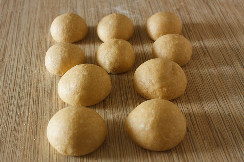 Подошедшее тесто подрастет, будет воздушным, такое можно и формовать! Но сперва нужна предформовка :) Разделите тесто скребком на кусочки, вес которых зависит от того, с какого количества жгутов вы хотите приготовить халу (в среднем по 90-110 гр. для халы из шести жгутов и по 200 для халы из двух). Рассчитывайте на общий вес изделия 500-600 гр. Необходимо округлить кусочки теста и отправить на отлежку на 15-20 минут до размягчения. Как только это случилось, раскатайте шарики в жгуты, после чего приступите к плетению.
