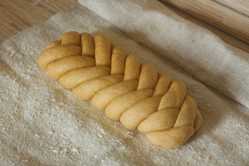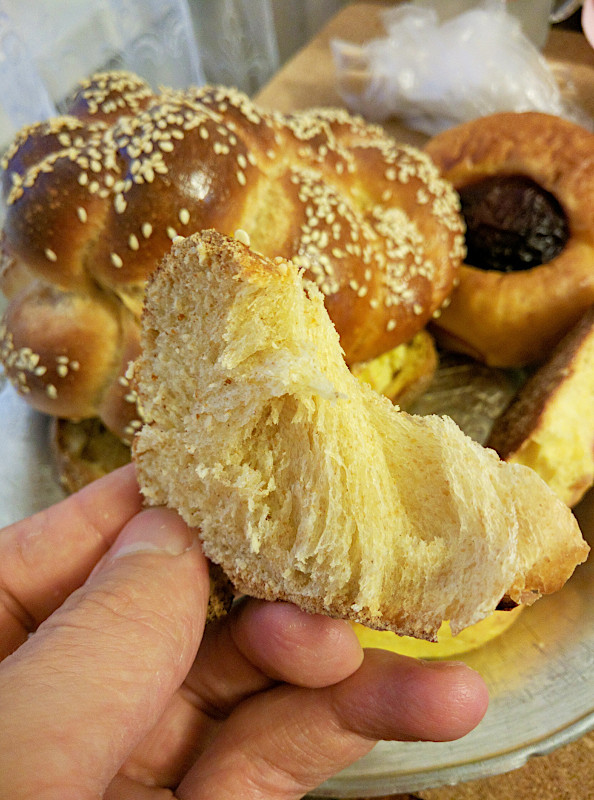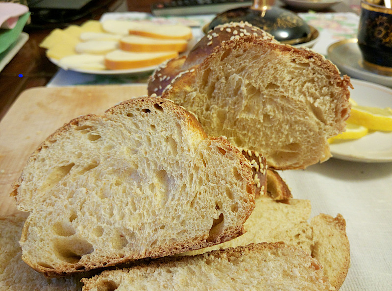Эта сдоба стала для меня открытием. Не скажу, что никогда ее не пробовал, но после того, как сам приготовил, посмотрел на нее иначе. Тут нет сливочного масла, что традиционно для халы, и малый процент сахара, но много яиц, а мякиш у нее получается практически слоистый, его, как кулич, можно по нитям выдергивать. За основу взял рецепт из книги Джеффри Хамельмана “Хлеб”, но немногоего изменил, добавив пшеничной цельнозерновой муки и поменяв технологию, внеся часть муки в опару на фруктовых дрожжах. Последние этой сдобе добавили совершенно особенных сладких ноток в аромате!