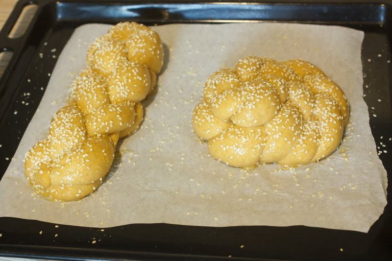 Несмотря на школьную "пятёрку" по математике, сложив 320 и 290 (грамм муки в основном тесте, если кто не понял))), получил в итоге 410. Осознал это когда ферментация в холодильнике уже подходила к концу, решил печь невзирая ни на что. Удалось даже раскатать жгуты и сплести их в косичку, которая, впрочем, ожидаемо расплылась при расстойке.
