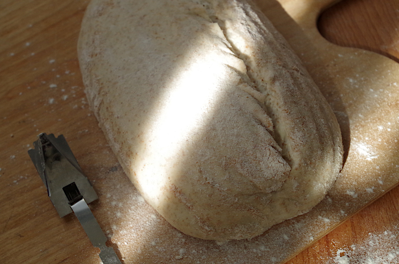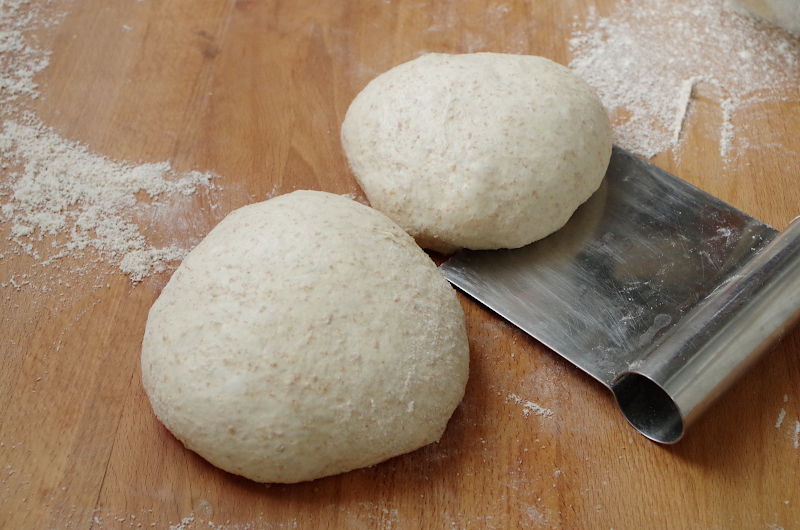 Скребком разделите на две части, каждую округлите и подтяните на столе, чтоб поверхность теста стала напряженной, но внутренняя структура не нарушилась, дайте отдых около 15 минут.